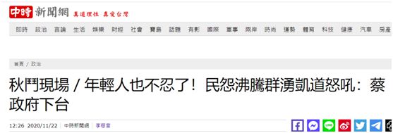 台媒此前报道称,11月22日,蓝营将在岛内发起“反莱猪(即含瘦肉精的猪肉)”、“挺中天”大规模游行抗议活动,报道说,这不仅是蔡英文连任后第一场大型抗议活动,更可望创下“秋斗”30年历史上的最大规模纪录。