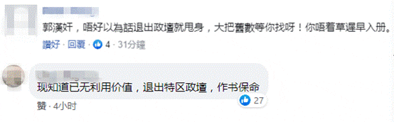 也有网友称,“郭汉奸,不好以为说退出政坛就甩身(脱身),大把旧数等你找呀!你唔着草(逃跑)迟早入册。”“现知道已无利用价值,退出特区政坛,作书保命。”