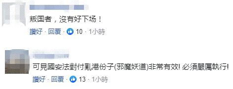 在港媒评论区称,有网友对郭荣铿的举动表示,“叛国者,没有好下场!”“可见国安法对付乱港分子(邪魔妖道)非常有效!”