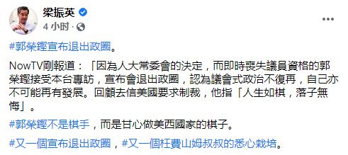 全国政协副主席、香港特别行政区前行政长官梁振英21日在脸书发文谈及郭荣铿宣布退出政圈表示:“郭荣铿和绝大多数公民党成员一样,以为身为大律师、以为英语灵光就懂国际政治,其实统统是初哥,结果是被外国人吸收。”梁振英又称:“郭荣铿温和?温和不温和要看政治立场,历史上不少卖国贼表面上都是温文儒雅的。郭荣铿绝不温和。”