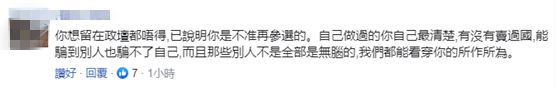 还有网友说,“你想留在政坛都不得,已说明你是不准再参选的。自己做过的你自己最清楚,有没有卖过国,能骗到别人也骗不了自己,而且那些别人不是全部是无脑的,我们都能看穿你的所作所为。”