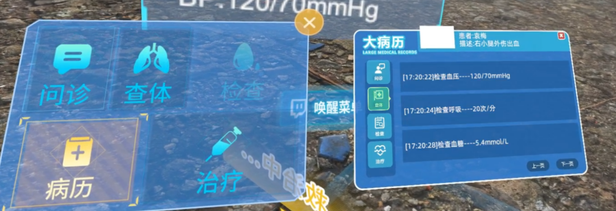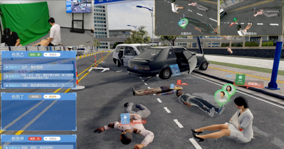 系统支持多人穿戴实训设备,参与多人配合案例,完成数字世界内的协同救援。患者赋予人工智能的能力,操作者可以与虚拟患者进行问诊。