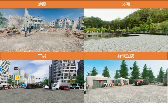 具备地铁内、冰雪灾害、山体滑坡、泥石流现场救援、核泄漏场景、海滩救援场景、急诊重症监护室(EICU)、战场、车祸现场、城市洪涝灾害、工厂、地震、商场、公园、城市场景等医疗救援3D虚拟现实场景