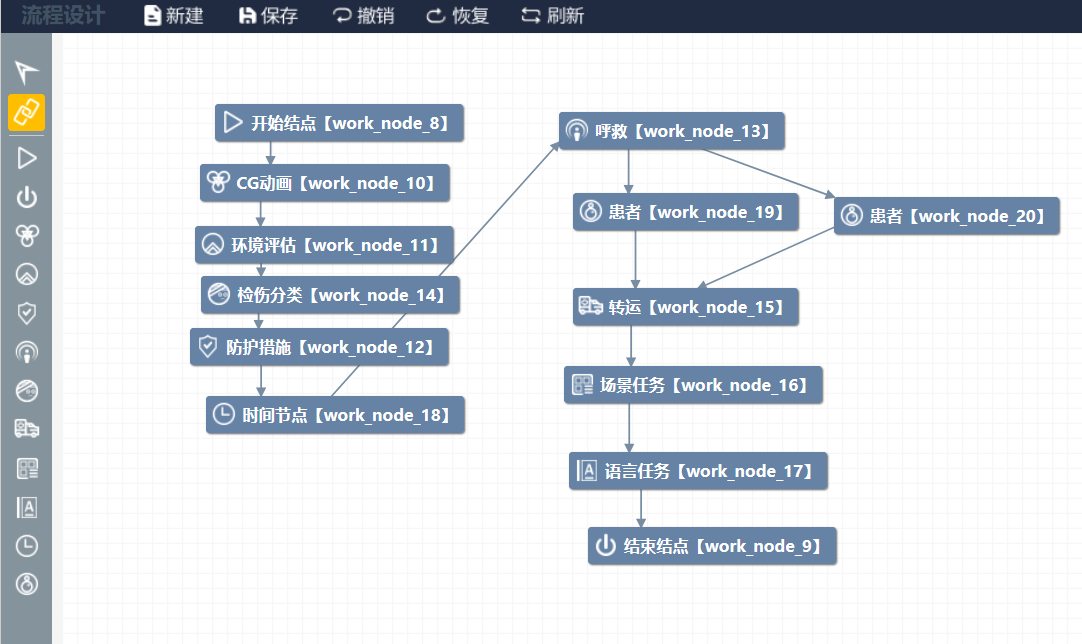 本模块建成场景和案例后台系统,支持导入场景资源,编辑案例。将病例、场景、角色、流程等信息录入,并打破案例之间的壁垒,支持后续案例补充,实现虚拟训练系统的可持续发展。案例可在后台进行数据模拟,学生通过数据模拟了解救治过程,了解院前救治的紧张感。