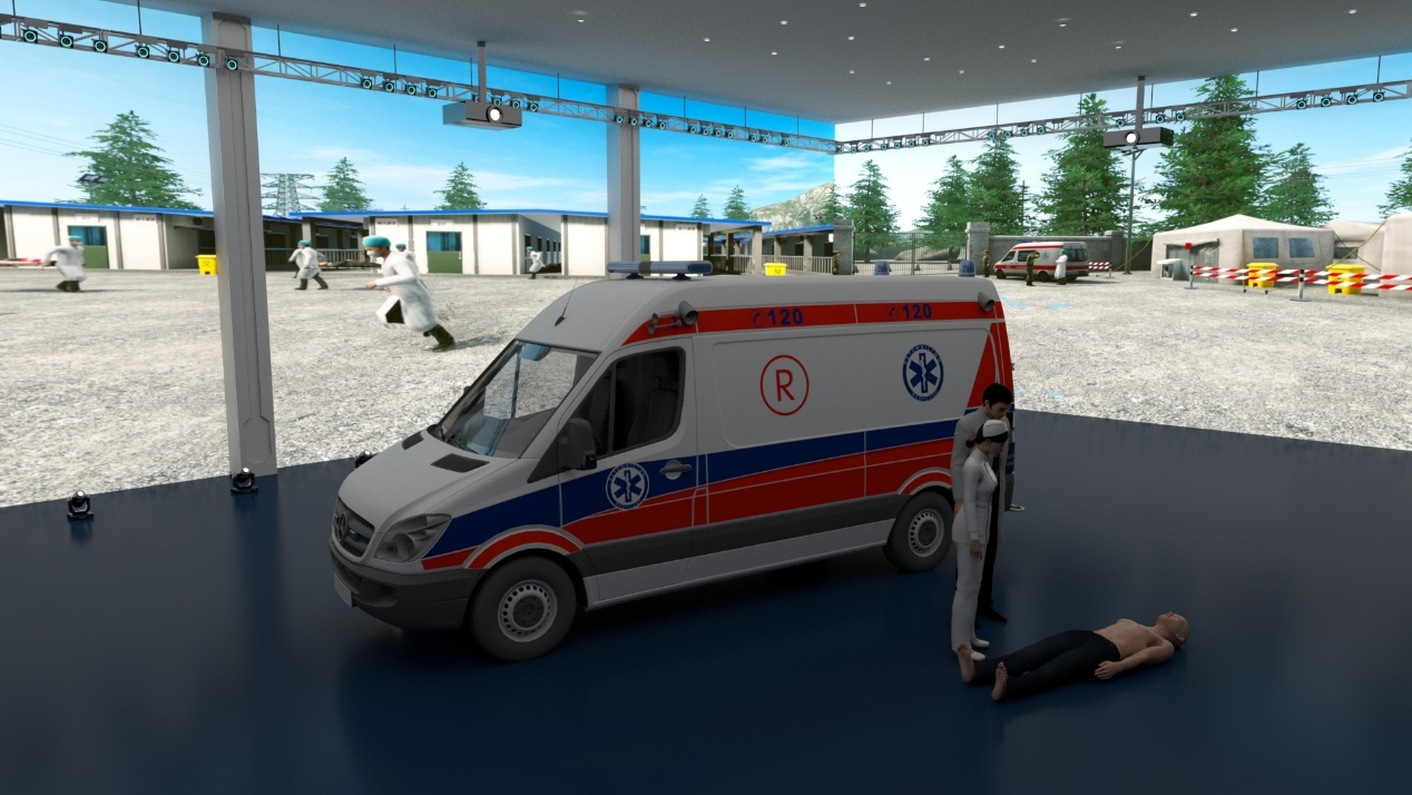 救护车模拟救援系统包含模拟救护车与虚拟病人系统,可模拟重大事故后转运救援训练,学员能对伤员执行车上呼吸通气操作,系统自动反馈监测结果。系统采用 3D 建模构建救护车场景、虚拟病人及诊疗设备,模拟呼吸机可操作且采用生理驱动模型,支持病例参数设定与呼吸机参数调节;虚拟病人支持 AI 智能语音问诊,以高质量拟真语音回应,同时对临床呼吸机干预自动反馈气道峰压、平台压、平均气道压、PEEP/CPAP 等生理变化数据,配备综合评分系统并以可视化图形展示学员最终得分。