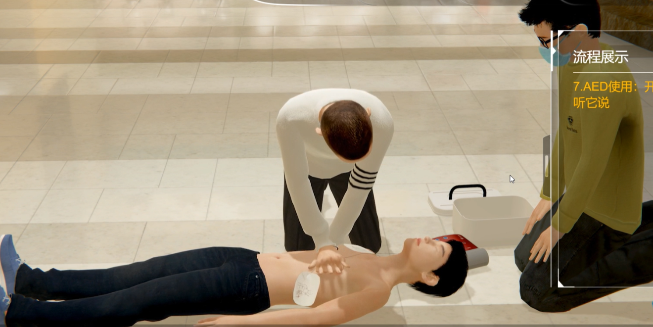 系统构建虚拟模拟人,可透视人体大脑、心脏、血供等组织,CPR 操作时同步呈现胸腔起伏、泵血等动态反馈;涵盖 CPR 全流程可视化教学:轻拍呼喊判断患者意识、检查颈动脉搏动,讲解胸外按压原理、手法、姿势,演示开放气道、人工呼吸动画,讲解 AED 使用及电击适用情况,操作后再次判断颈动脉搏动确认抢救效果。